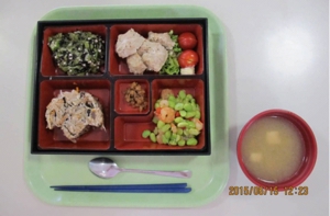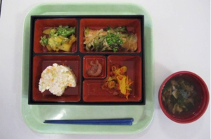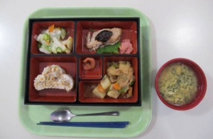 - 「おたのしみ御膳」はその月に旬を迎える食材を使用して、料理や味に変化を出した献立にしています。献立の分類は、主食、副食3品、汁物、デザートで普段より1品多くしています。また和食は好まれますが、和食ばかり続かないようにしています。